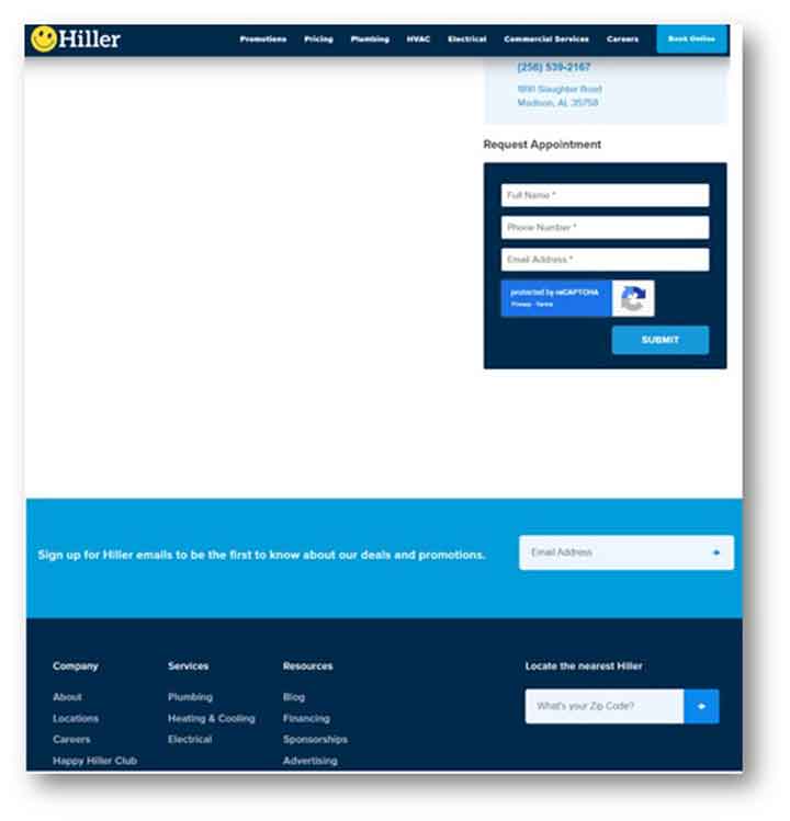 The plumbing company has placed CTAs in different formats in multiple locations of the website. There is a CTA at the top ‘Book Online’, in the middle ‘Request Appointment’, and at the end ‘Sign up for Hiller emails…’ and ‘Locate the nearest Hiller’.